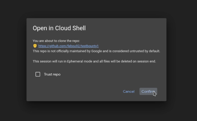 https://console.cloud.google.com/cloudshell/open?cloudshell_git_repo=https://github.com/[exampleRepository]/test&cloudshell_open_in_editor=helloworld.py - Victim: Clicks the link and is presented with the "Open in Cloud Shell" confirmation dialog.